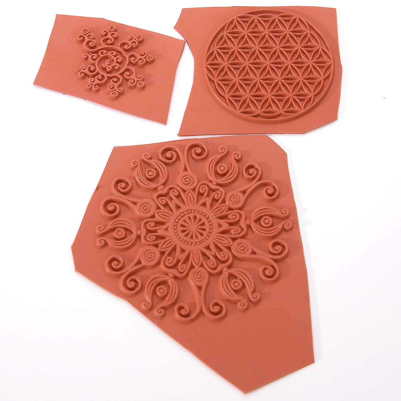 Vulkanisierte Stempelgummis mit einem tiefen Relief für die Selbst-Montage auf Handgriffe aus Holz oder Kunststoff.