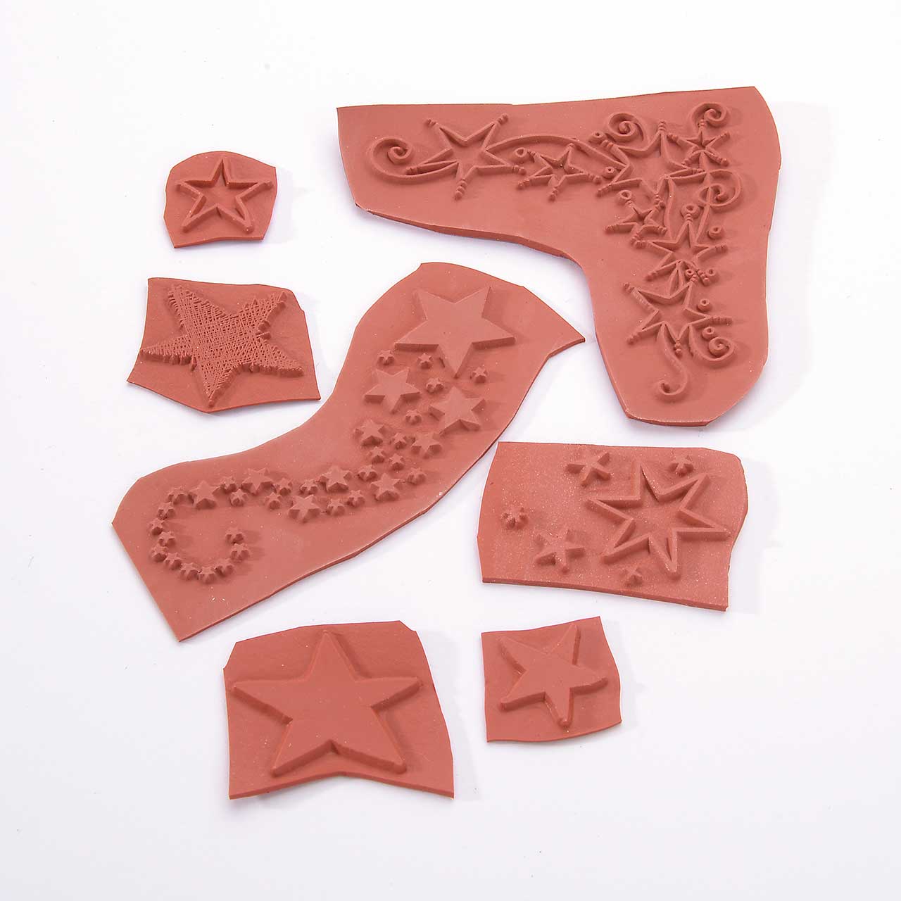 Vulkanisierte Stempelgummis mit einem tiefen Relief für die Selbst-Montage auf Handgriffe aus Holz oder Kunststoff.