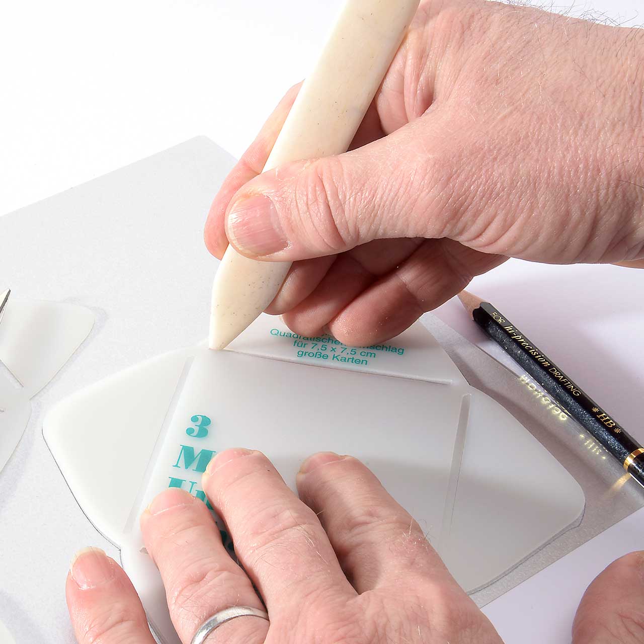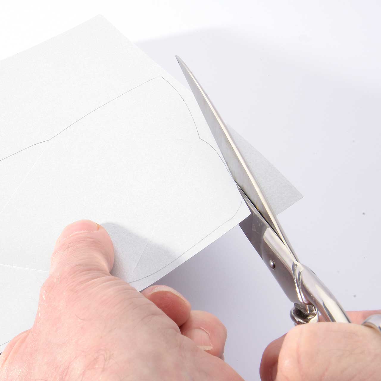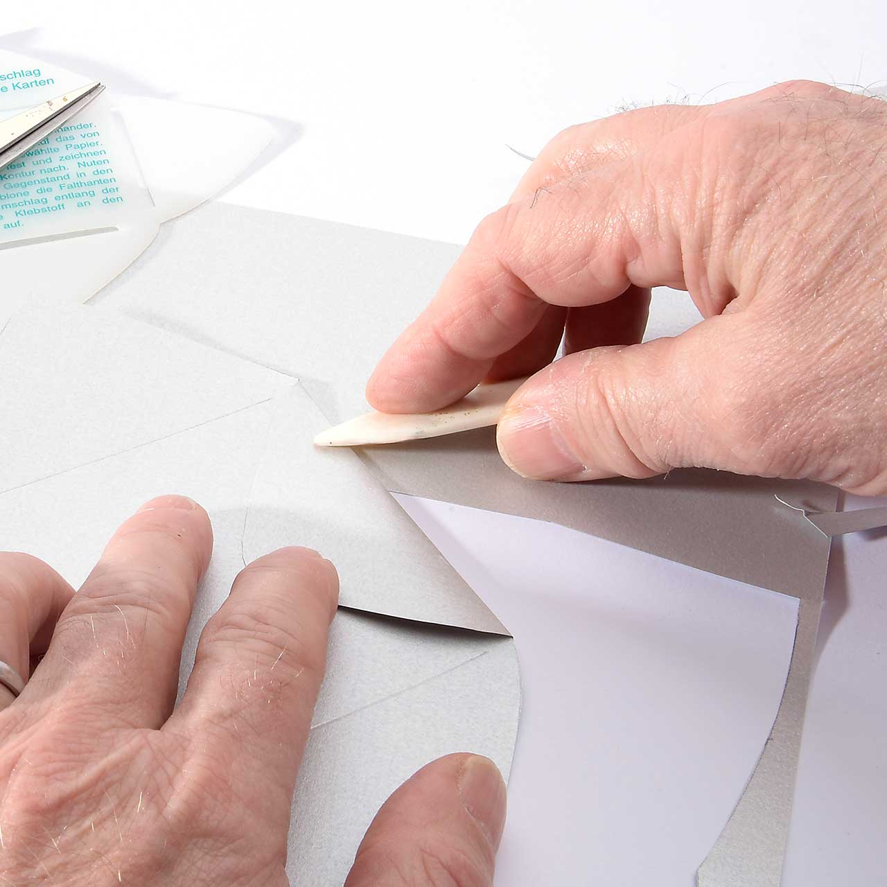 Ziehen Sie den Umriss der Schablone mit einem Bleistift nach und fahren Sie mit einem Falzbein oder einem stumpfen Stift durch die Schlitze. Nun wird das Papier entlang der Bleistiftlinie ausgeschnitten und die Seitenlaschen nach innen gefaltet. Nutzen Sie den Kleberoller um die Laschen aneinander zukleben.