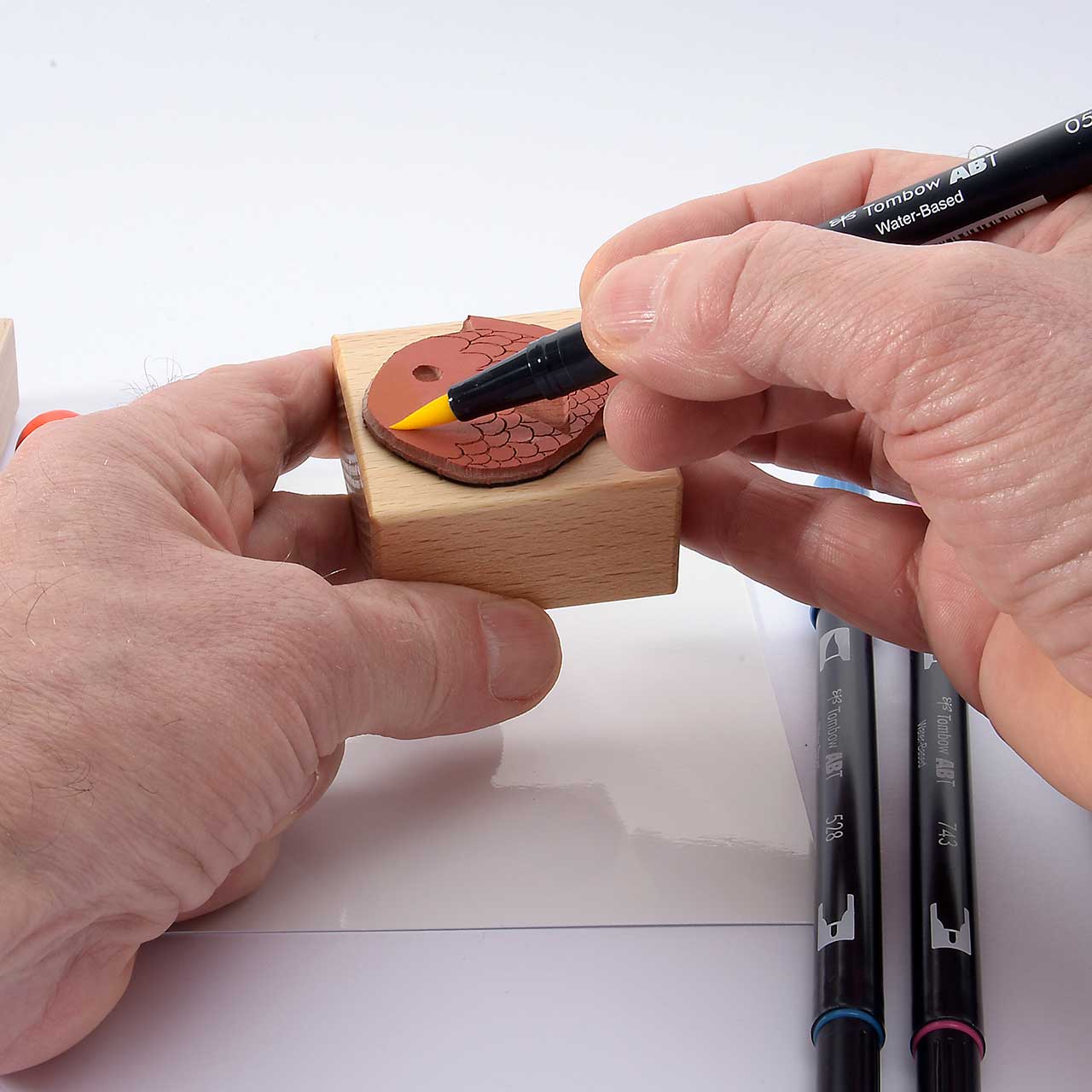 Malen Sie den Flächen-Stempel mit den Tombow Dual Brush Pen Faserschreibern an und drücken Sie ihn auf Ihre Kromo Postkarte. Halten Sie den Stempel fest und legen Sie den Stempelanlegewinkel an. Nun stempeln Sie die Kontur auf das bunte Motiv.