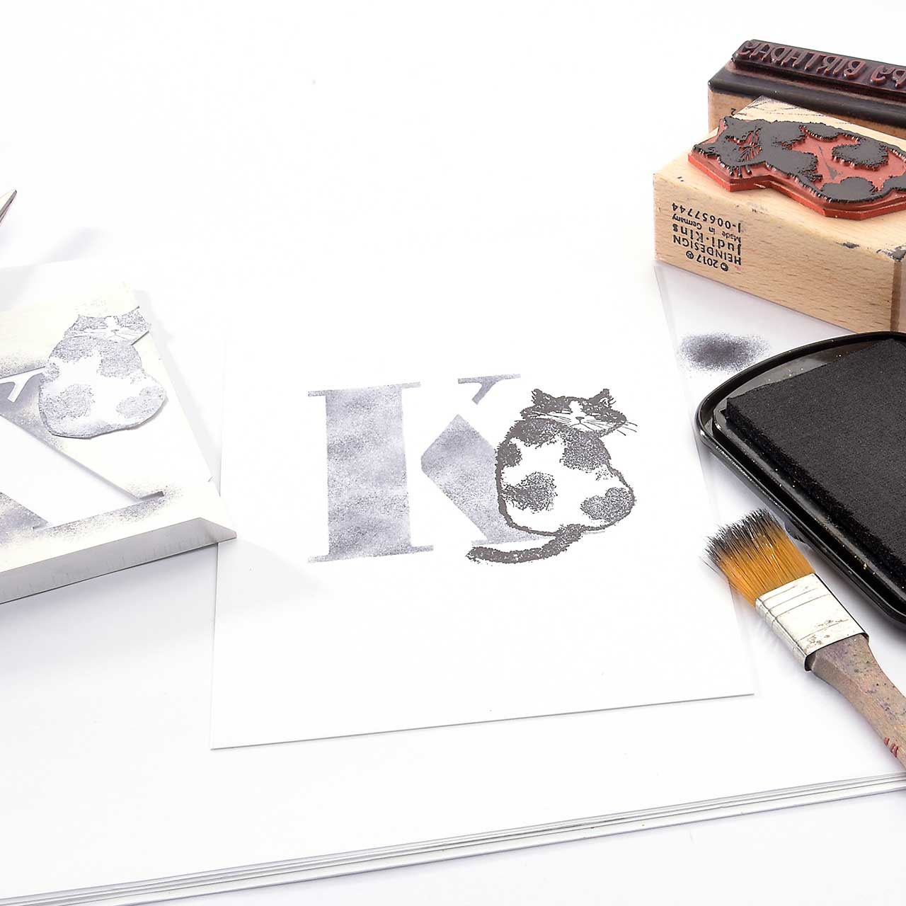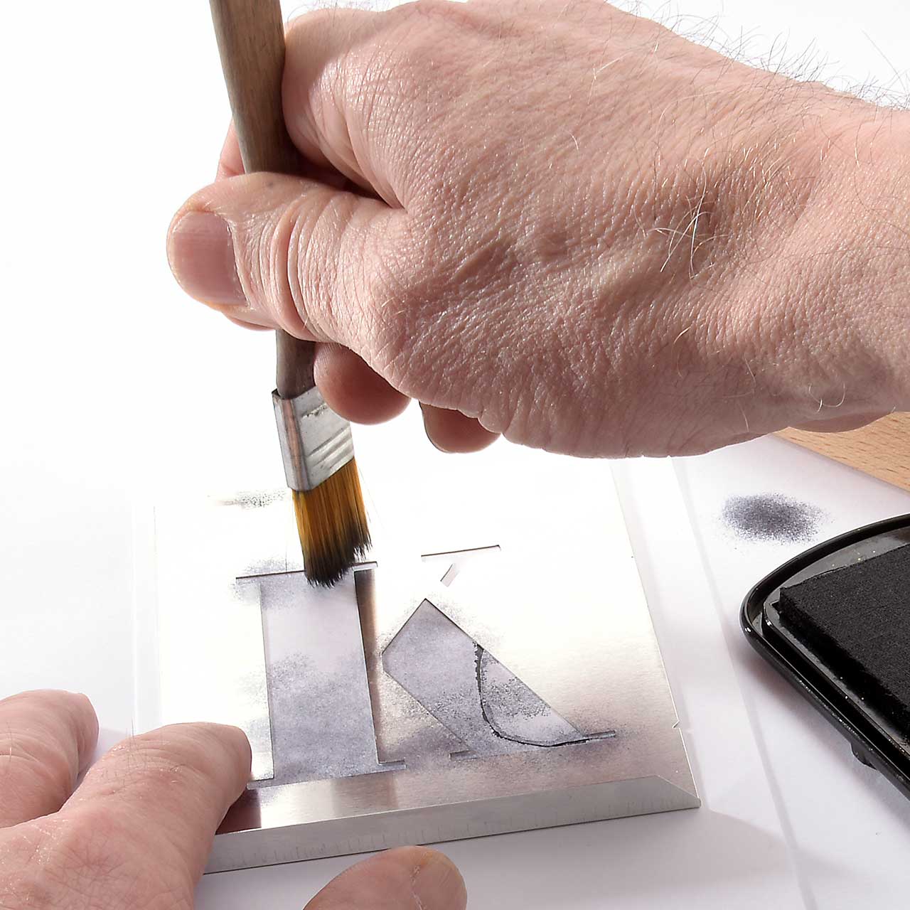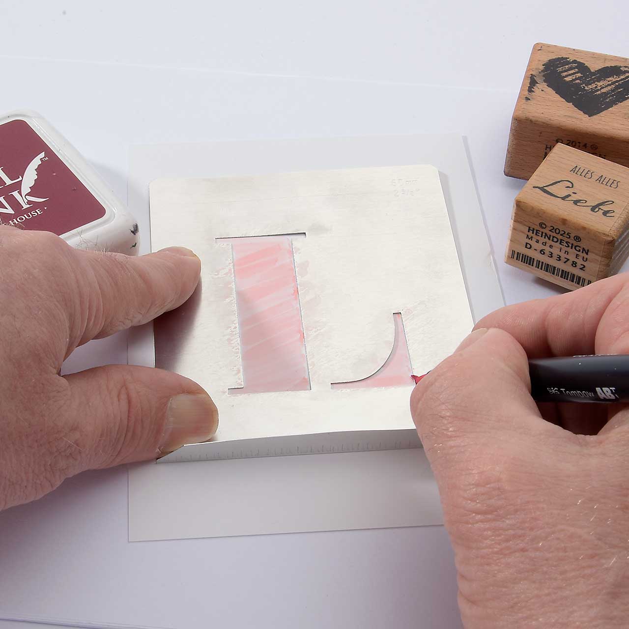 Besonders akkurat wir der Farbauftrag, wenn Sie mit dem Pinsel Farbe aus einem Stempelkissen aufnehmen und auf die Schablone tupfen.