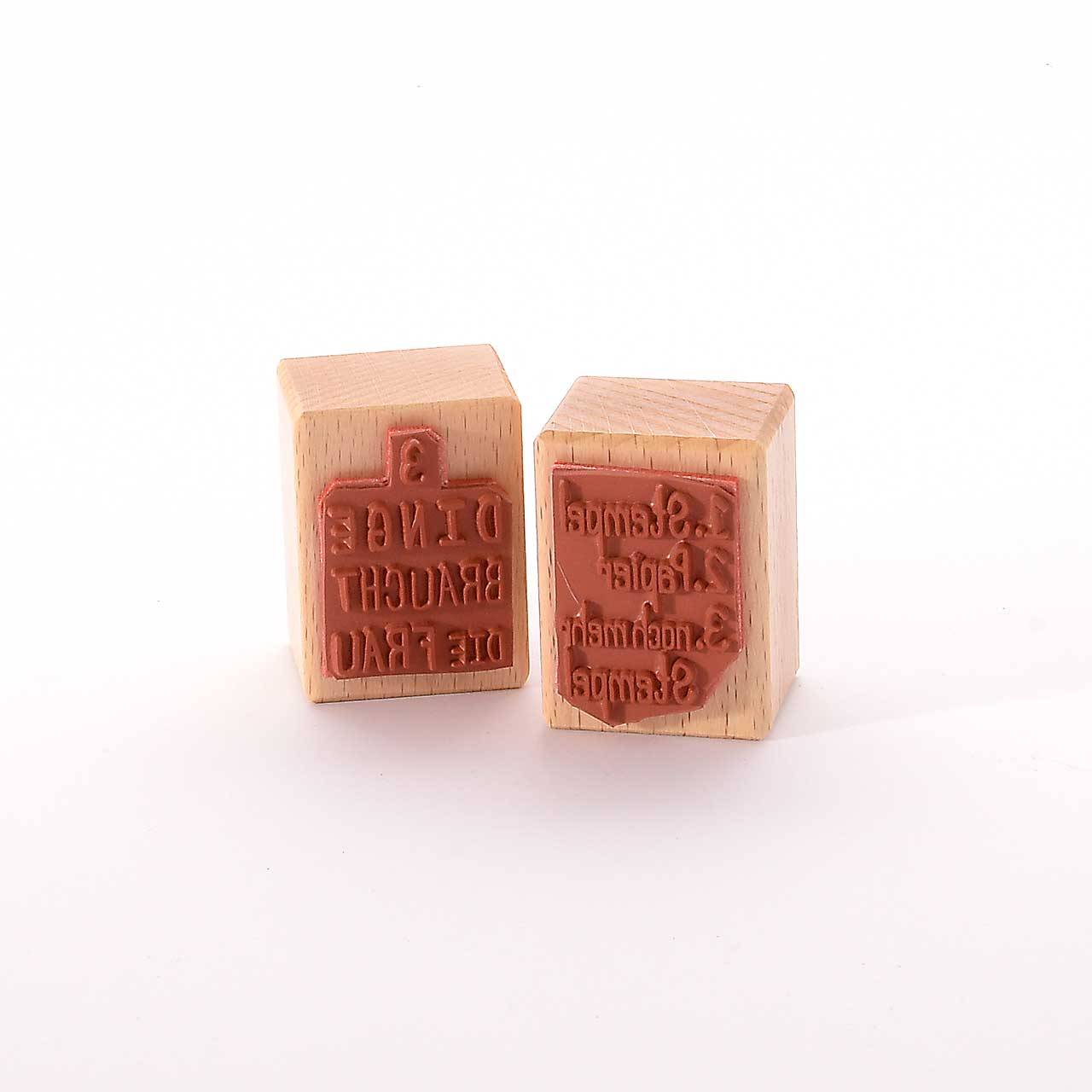 Für eine gute Handhabung der Stempel wird das Stempelgummi mit einer dämpfenden Schicht auf einen Griff geklebt. Dieser Griff besteht aus einem lackierten Buchenholzklötzchen, das das Motiv in original Größe zeigt.