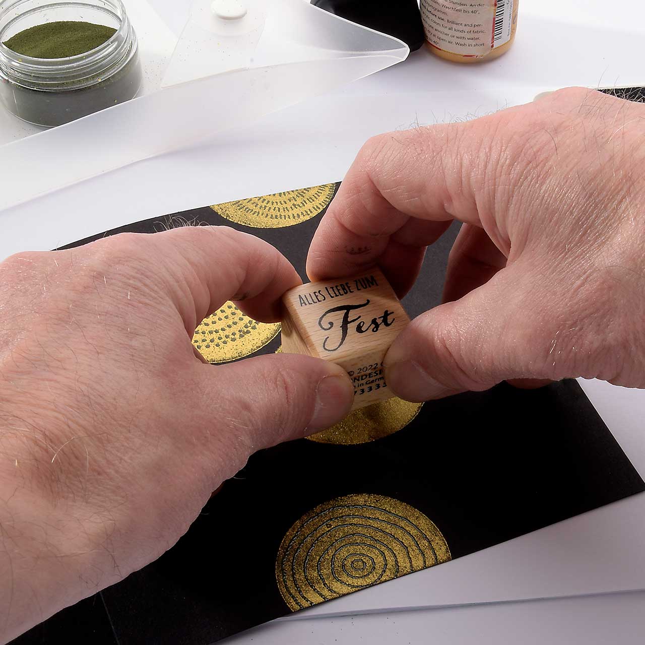 Für eine gute Handhabung der Stempel wird das Stempelgummi mit einer dämpfenden Schicht auf einen Griff geklebt. Dieser Griff besteht aus einem lackierten Buchenholzklötzchen, das das Motiv in original Größe zeigt.