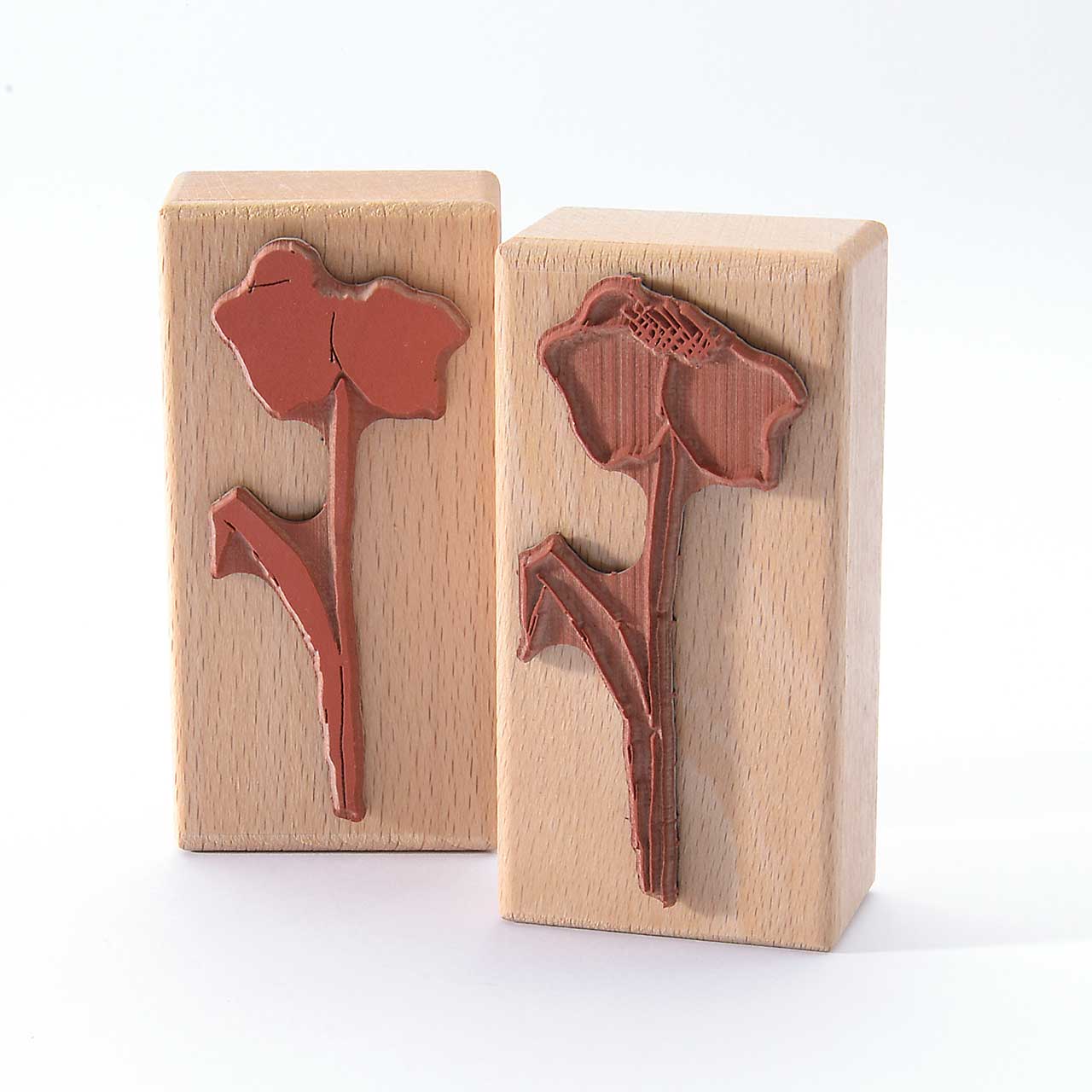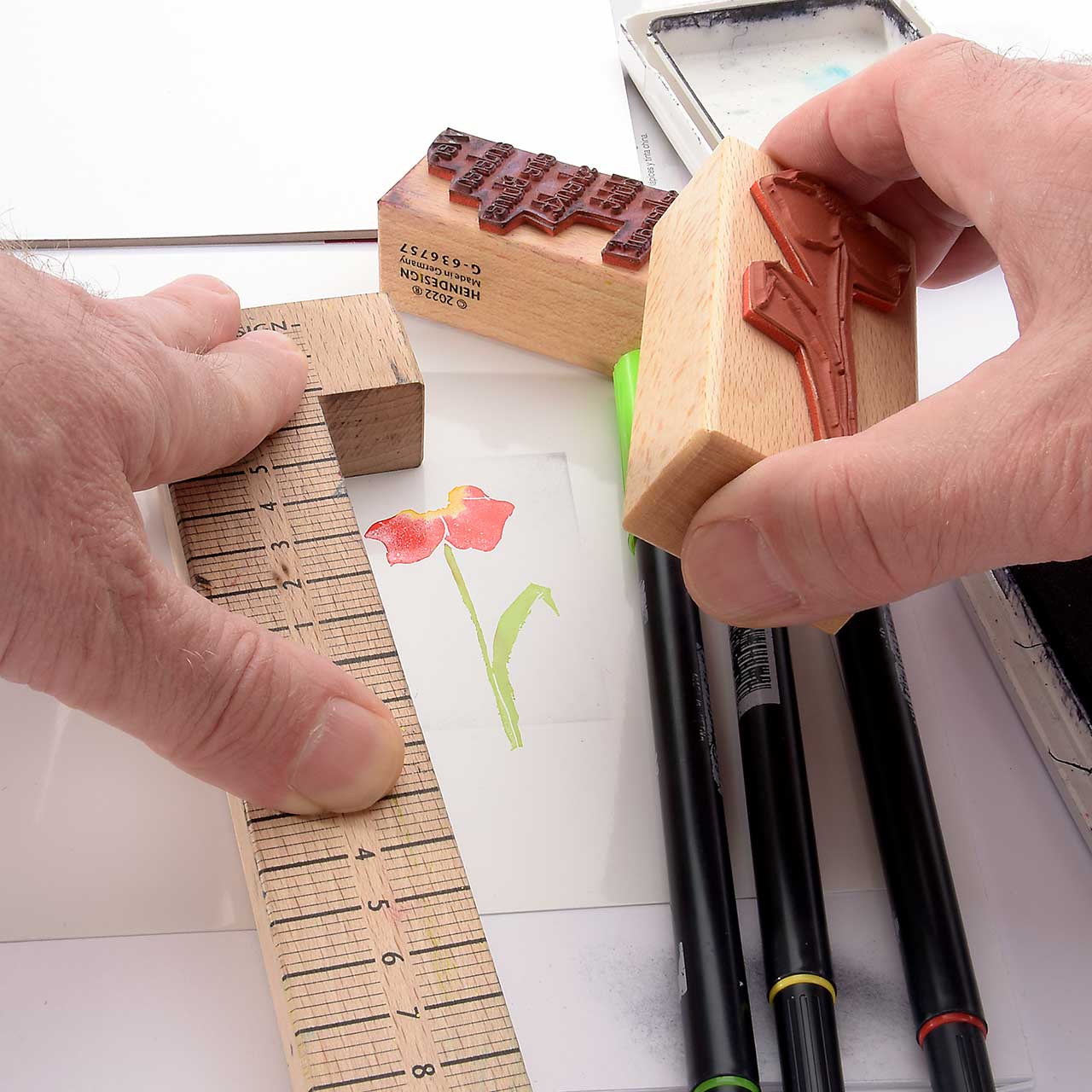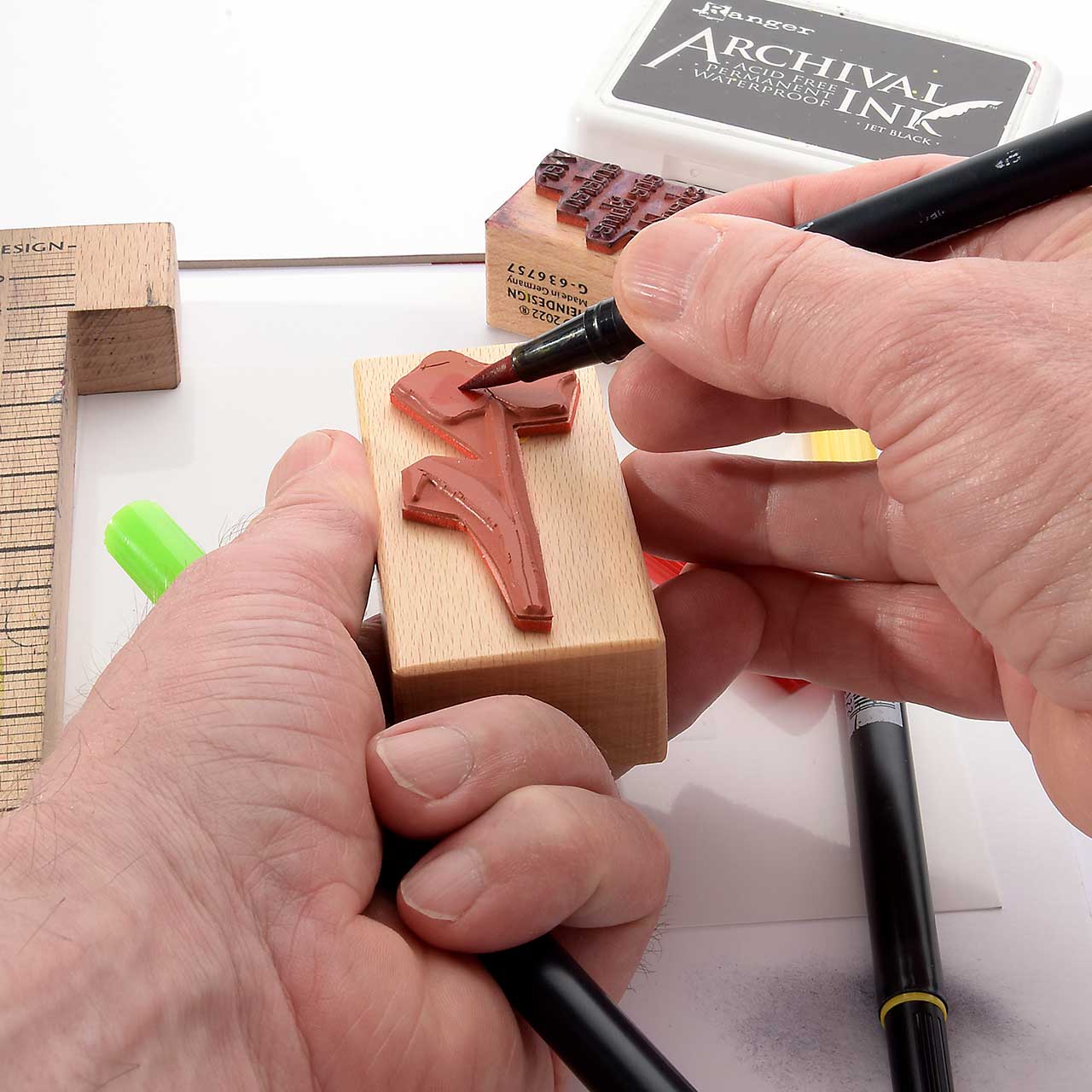 Für eine gute Handhabung der Stempel wird das Stempelgummi mit einer dämpfenden Schicht auf einen Griff geklebt. Dieser Griff besteht aus einem lackierten Buchenholzklötzchen, das das Motiv in original Größe zeigt.