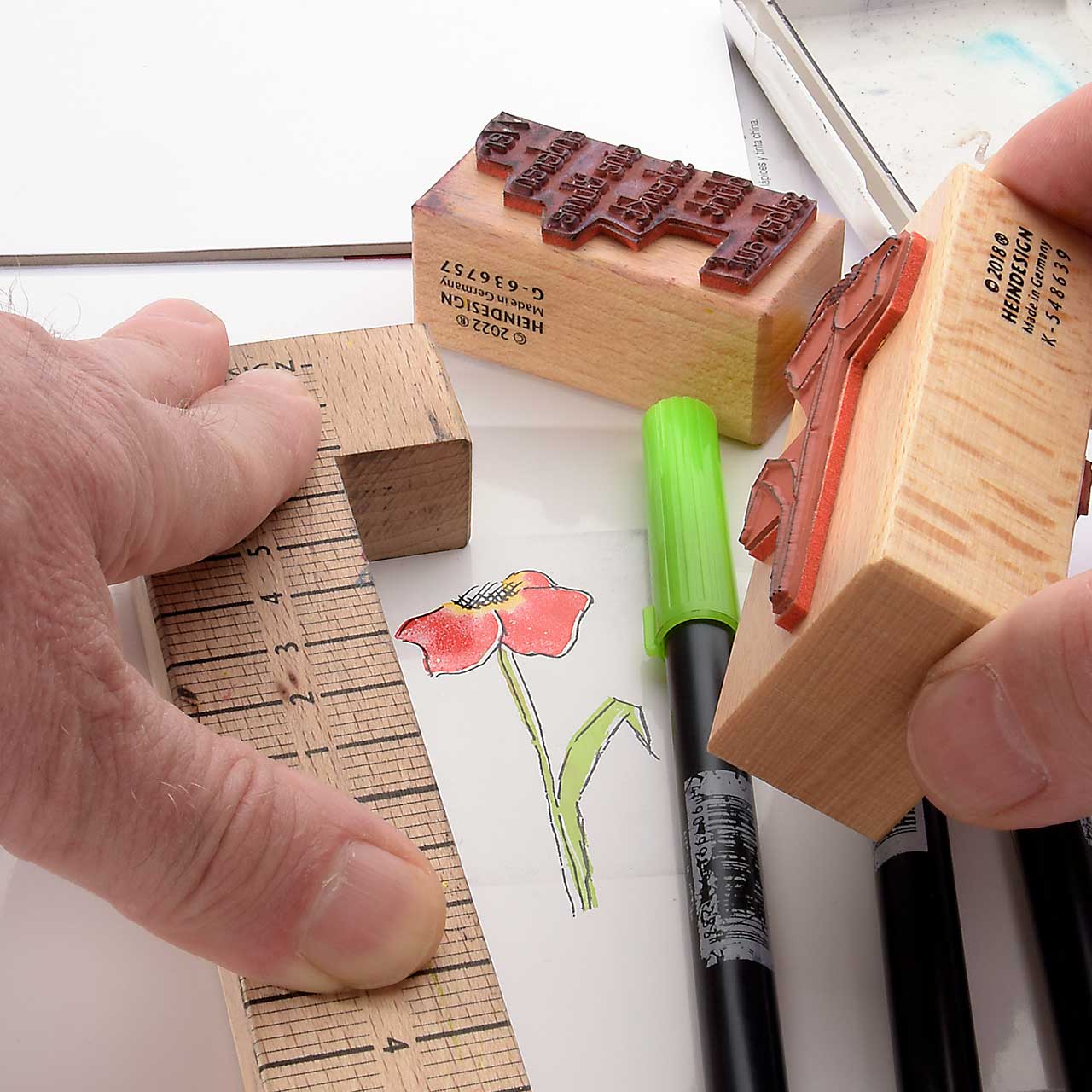 Bei der Stempelmontage wird das Stempelgummi so ausgerichtet, dass das Gummi genau unter dem Abbild auf dem Klotz klebt. So können Sie immer gerade und passgenau stempeln.