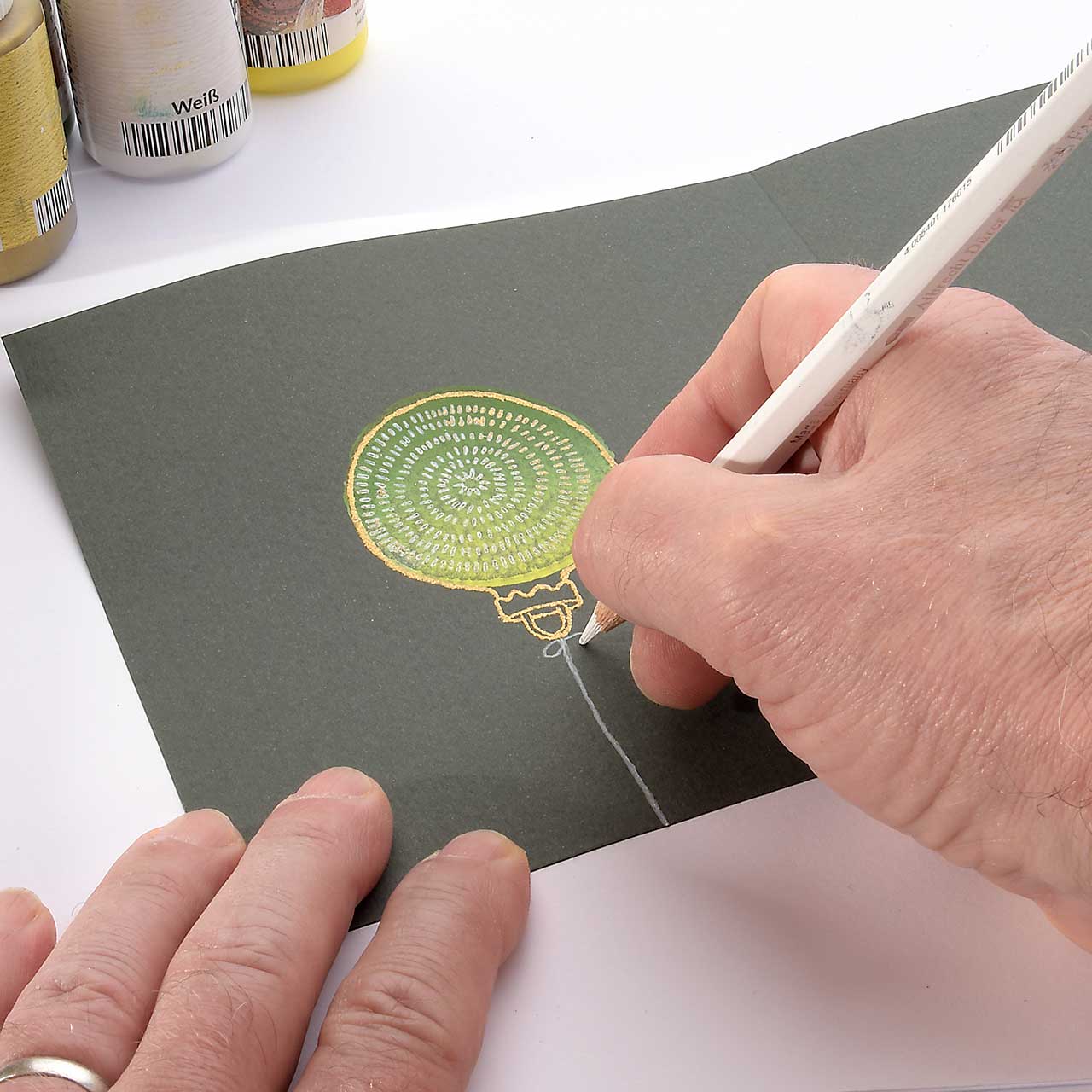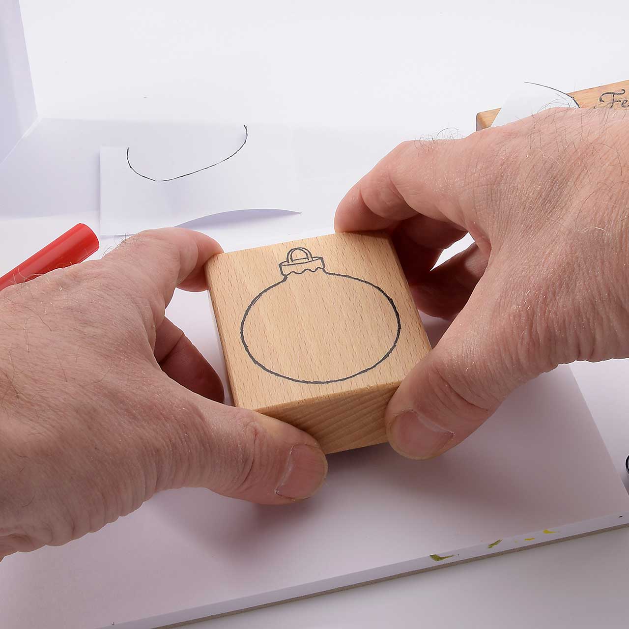 Für eine gute Handhabung der Stempel wird das Stempelgummi mit einer dämpfenden Schicht auf einen Griff geklebt. Dieser Griff besteht aus einem lackierten Buchenholzklötzchen, das das Motiv in original Größe zeigt.