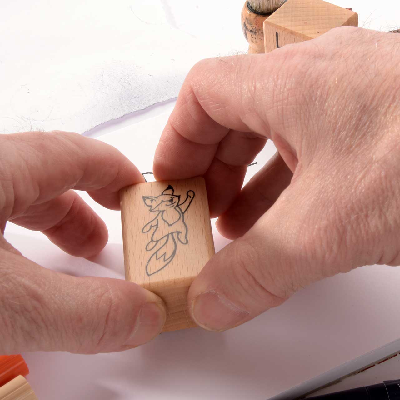 Für eine gute Handhabung der Stempel wird das Stempelgummi mit einer dämpfenden Schicht auf einen Griff geklebt. Dieser Griff besteht aus einem lackierten Buchenholzklötzchen, das das Motiv in original Größe zeigt.