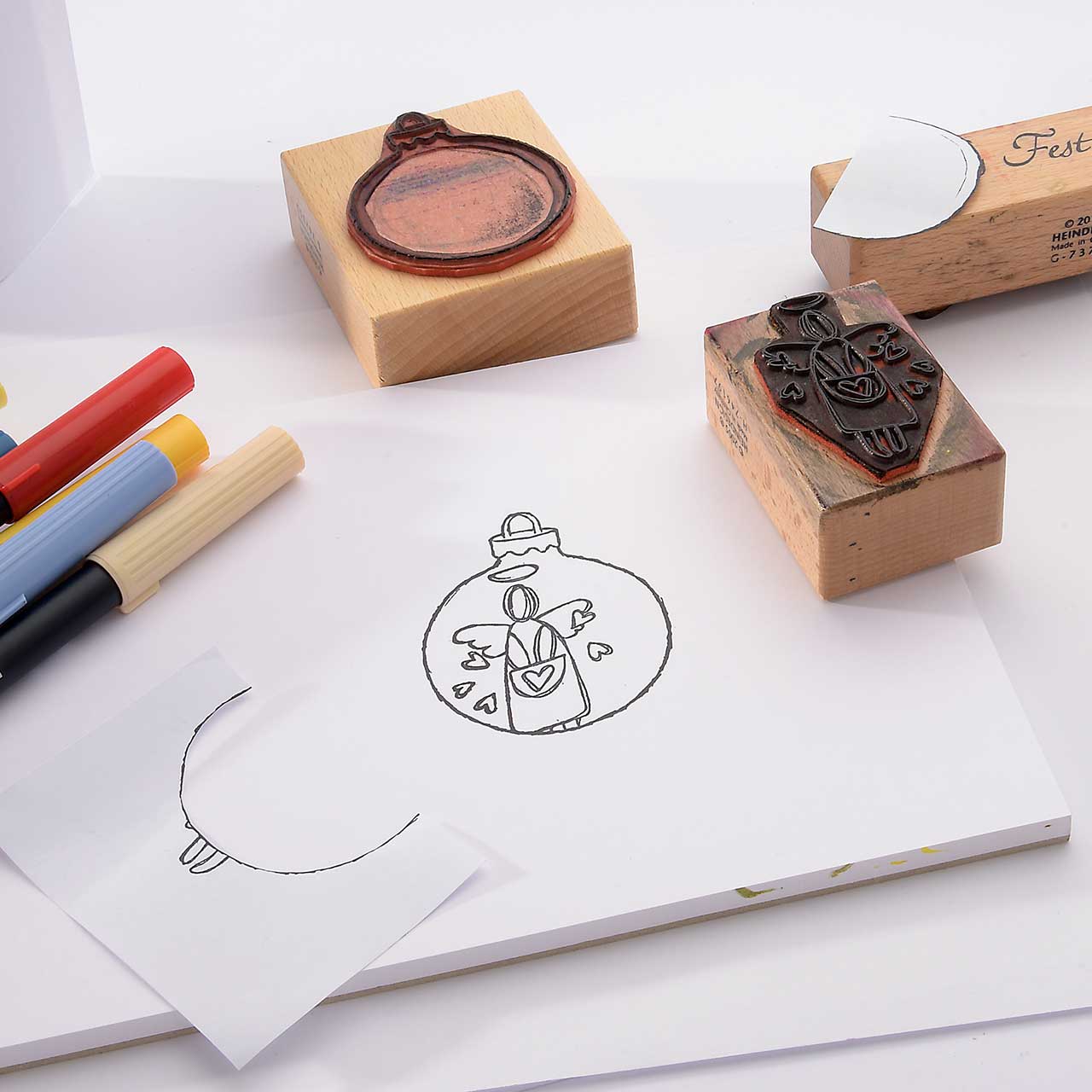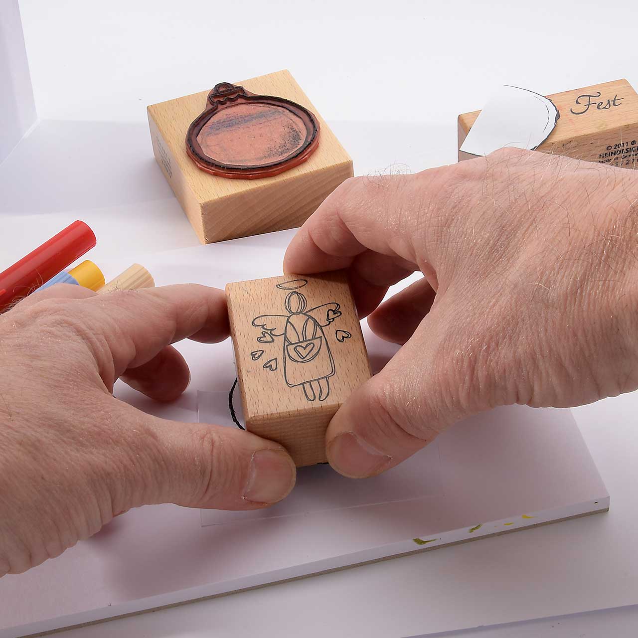 Für eine gute Handhabung der Stempel wird das Stempelgummi mit einer dämpfenden Schicht auf einen Griff geklebt. Dieser Griff besteht aus einem lackierten Buchenholzklötzchen, das das Motiv in original Größe zeigt.