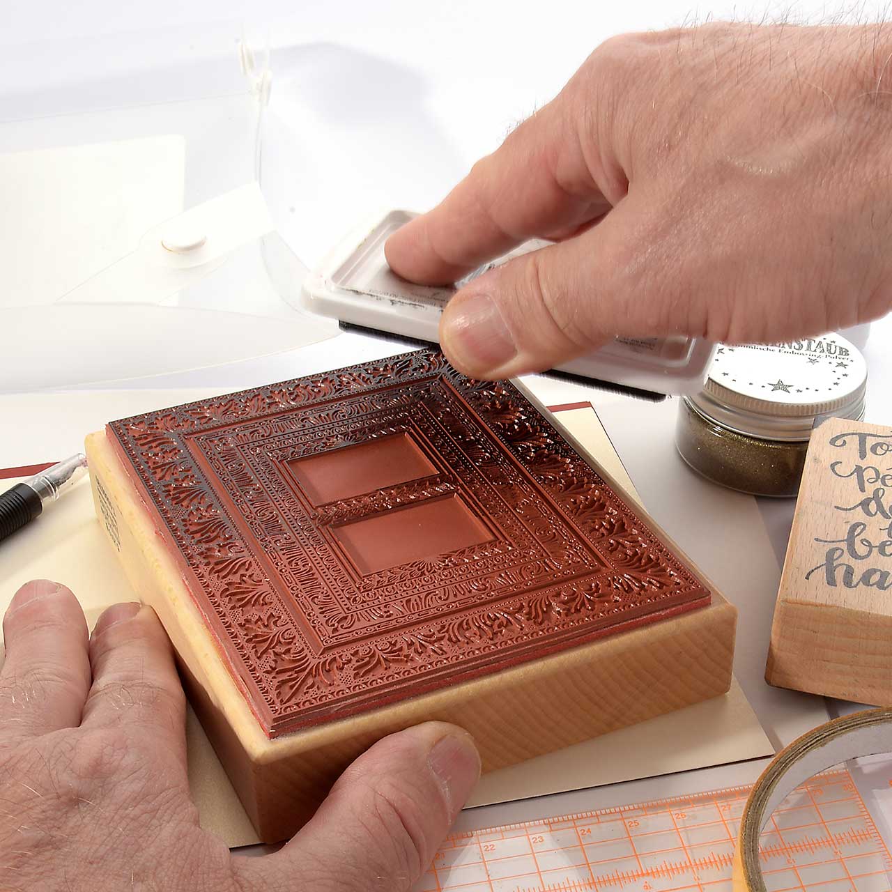 Das Stempelmotiv wird mit Hitze und Druck in das Gummi gepresst (vulkanisiert).