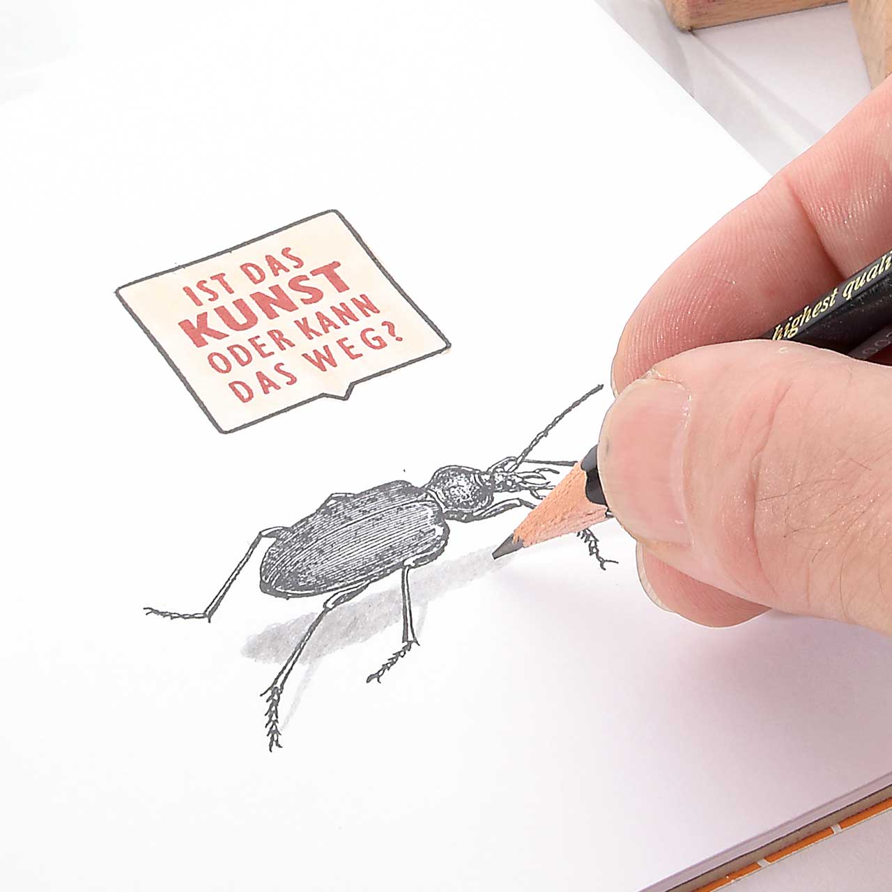 Für eine gute Handhabung der Stempel wird das Stempelgummi mit einer dämpfenden Schicht auf einen Griff geklebt. Dieser Griff besteht aus einem lackierten Buchenholzklötzchen, das das Motiv in original Größe zeigt.