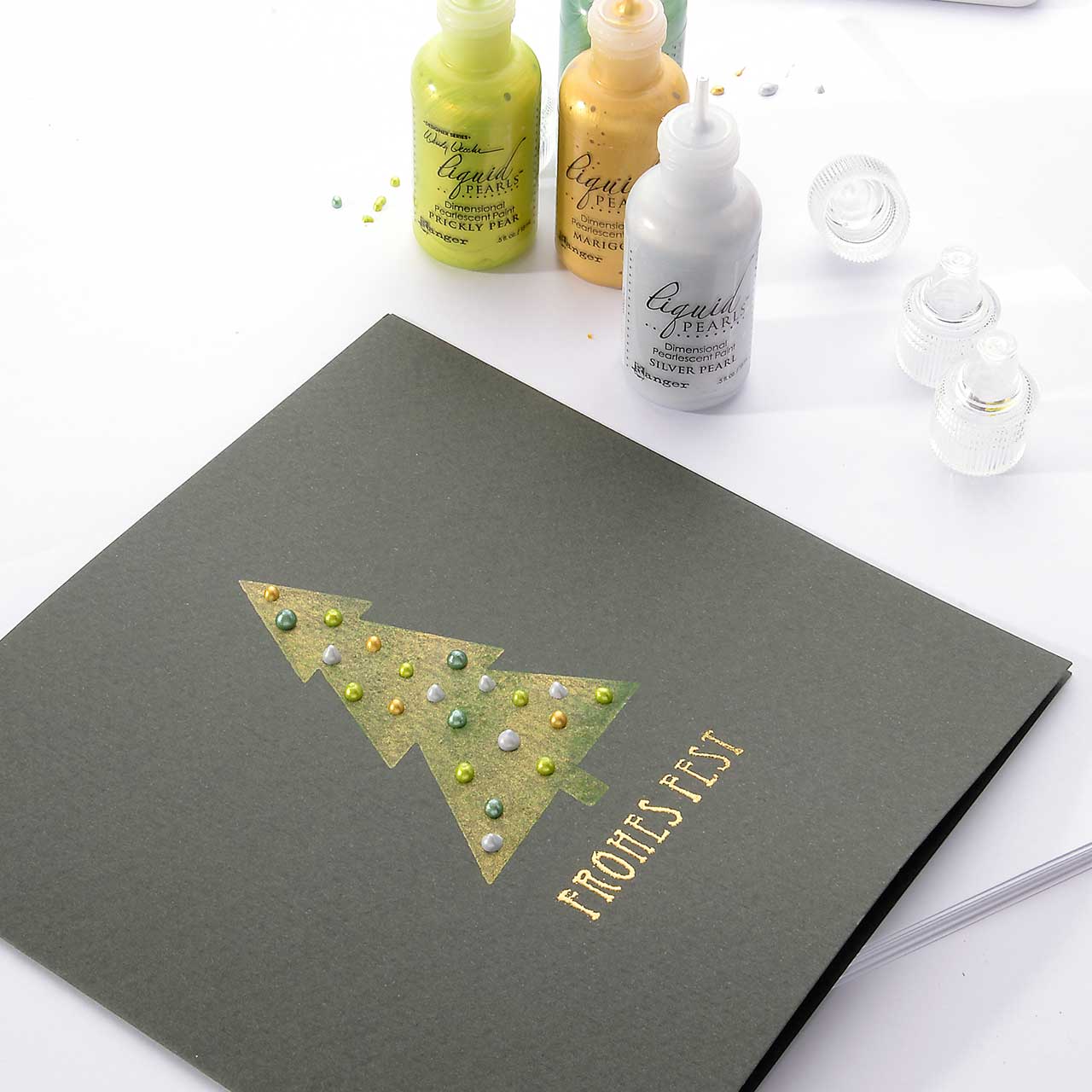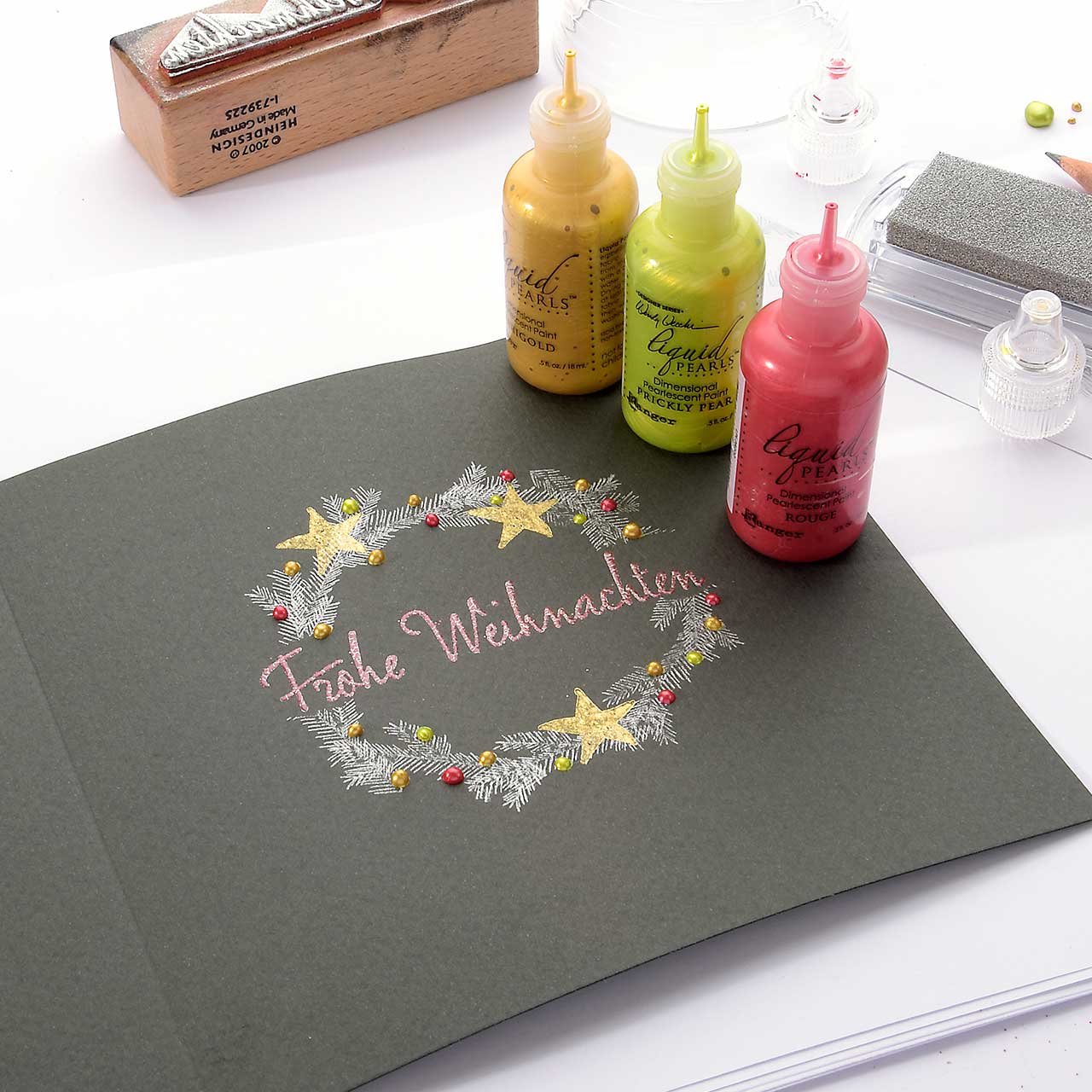 Die Liquid Pearls Farbe trocknet in der Dicke auf, in der Sie sie auftragen. So können Sie mit kleinen, dicken Tropfen Ihr Motiv verzieren. Mit der besonders feinen Spitze des Farbfläschchens können Sie dünne Linien und feine Tropfen auf Ihr Motiv bringen.