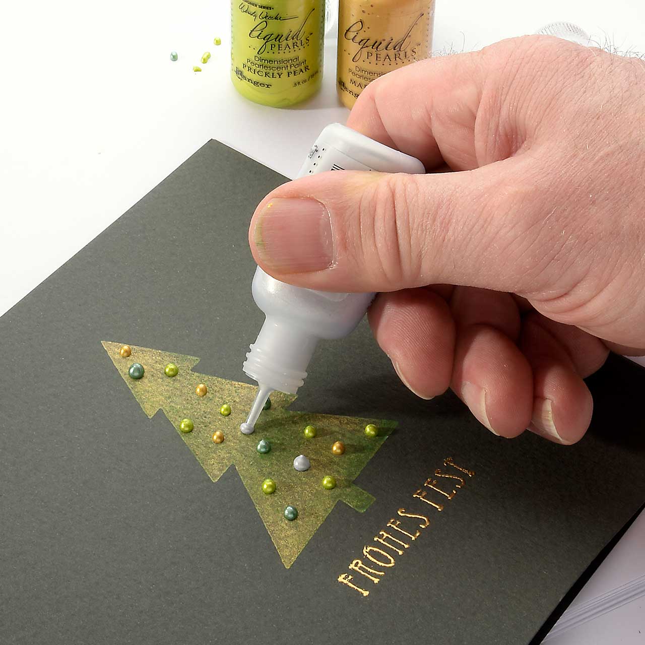 Die Liquid Pearls Farbe trocknet in der Dicke auf, in der Sie sie auftragen. So können Sie mit kleinen, dicken Tropfen Ihr Motiv verzieren. Mit der besonders feinen Spitze des Farbfläschchens können Sie dünne Linien und feine Tropfen auf Ihr Motiv bringen.
