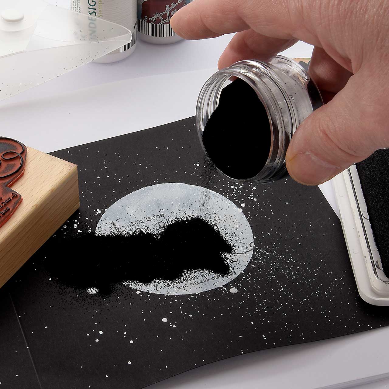 das Stempelabdrucken einen lackartigen Reliefcharakter verleiht. Dieser Effekt macht das Embossing zur zentralen Stempel-Technik.