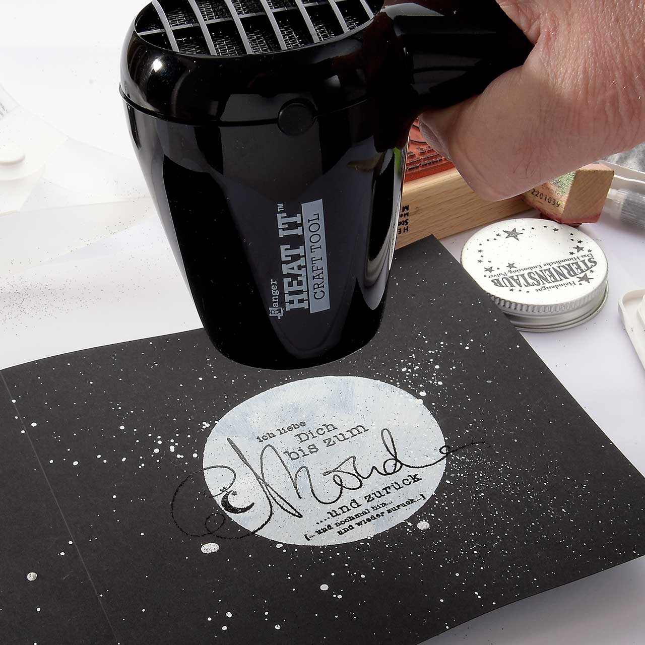 Mit Embossing können Sie Stempel-Motive haltbar auf die unterschiedlichsten Materialien auftragen. Neben Papier und Karton, können Sie auch Metall, Holz, Textilien und Kunststoff mit Sternenstaub verzieren. Dabei müssen Sie nur darauf achten, dass Ihr Material auch die Hitze des Embossing Prozesses verträgt.