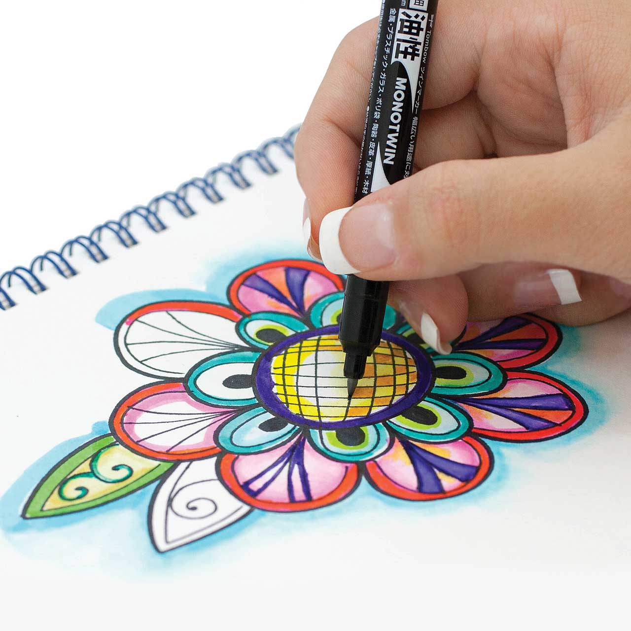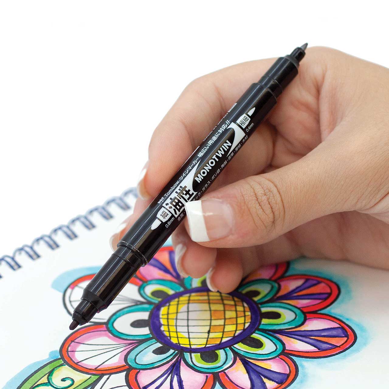 Der MONO twin Marker eignet sich besonders zum Beschriften, Markieren und Konturen zeichnen. Er schreibt mit hoher Deckkraft auf unterschiedlichsten Materialien wie Glas, Stein, Holz u.v.m. Mit breiter (0,8 mm) und feiner (0,4 mm) Spitze ist er vielseitig einsetzbar. Die Tinte ist ölbasiert und wasserfest. Bei Kolorierungen kann sie ohne Wartezeit sofort übermalt werden ohne zu verwischen. Ideal in Kombination mit den leuchtenden Farben der Tombow ABT Dual Brush Pens. Schreibfarbe: schwarz.