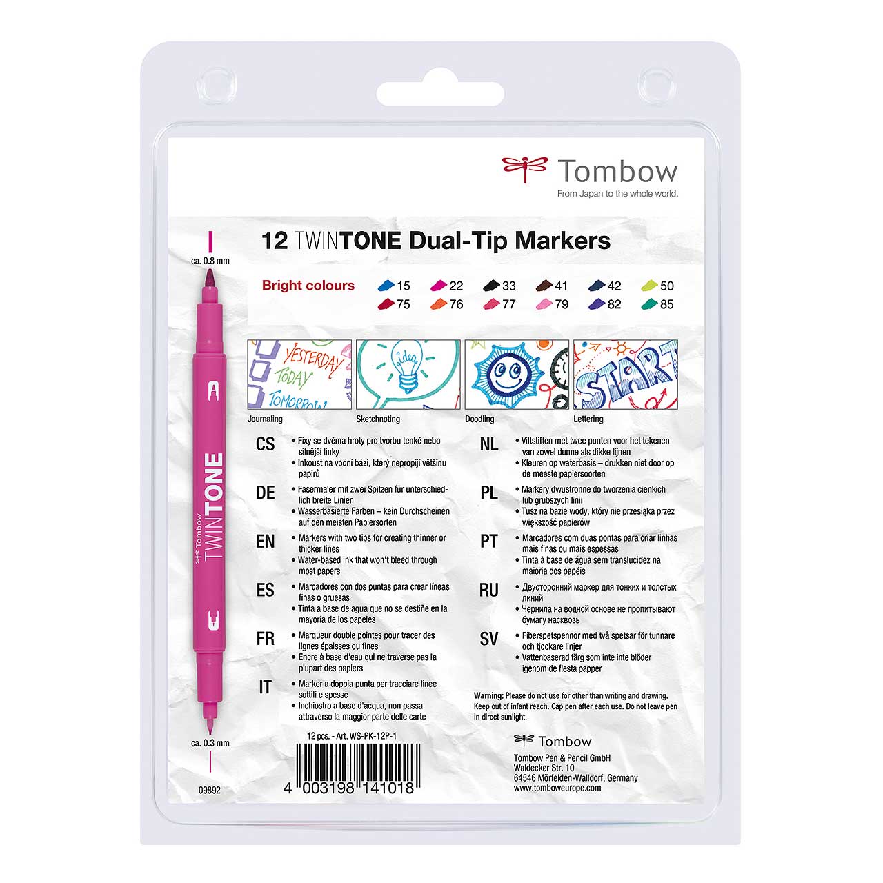 Fasermaler TwinTone mit zwei Spitzen für unterschiedlich breite Linien. Rundspitze mit 0,8 mm Strichstärke, Finelinerspitze mit 0,3 mm Strichstäke. Wasserbasierte Farben - kein Durchscheinen auf den meisten Papiersorten. Ideal für Journaling, Sketchnoting, Doodling, Lettering und vieles mehr. 12er-Set leuchtende Farben, Inhalt: 50 lime green, 85 emerald green, 15 blue, 42 navy, 82 grape, 22 pink, 79 candy pink, 77 cherry pink, 76 carrot orange, 75 strawberry red, 41 chocolate, 33 black.