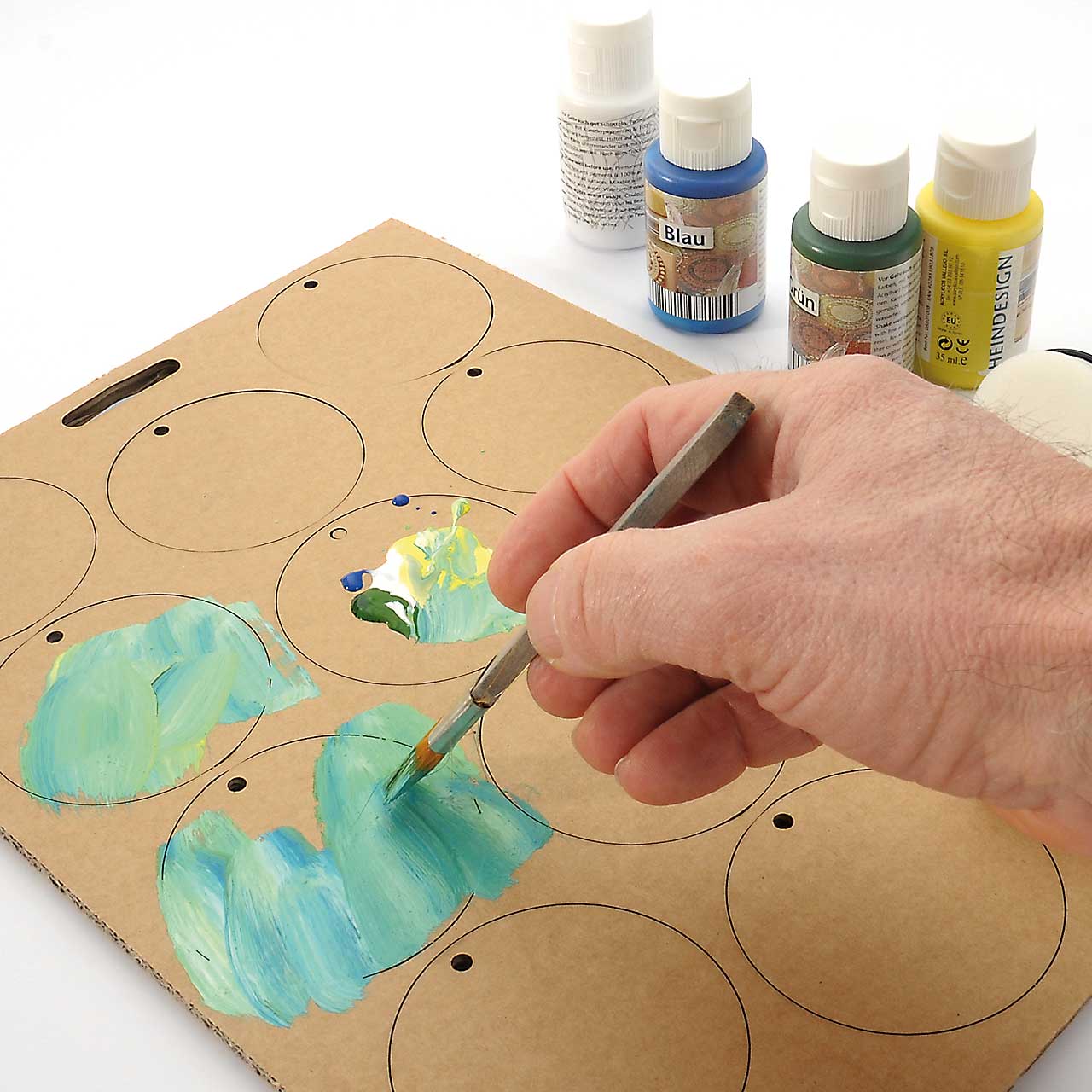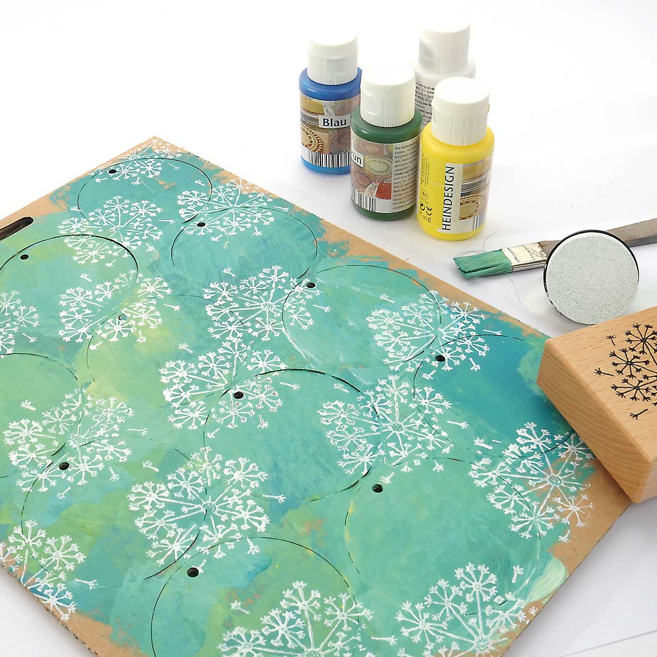 Die Wellpappe lässt sich leicht mit Acrylfarben bemalen und bestempeln.
